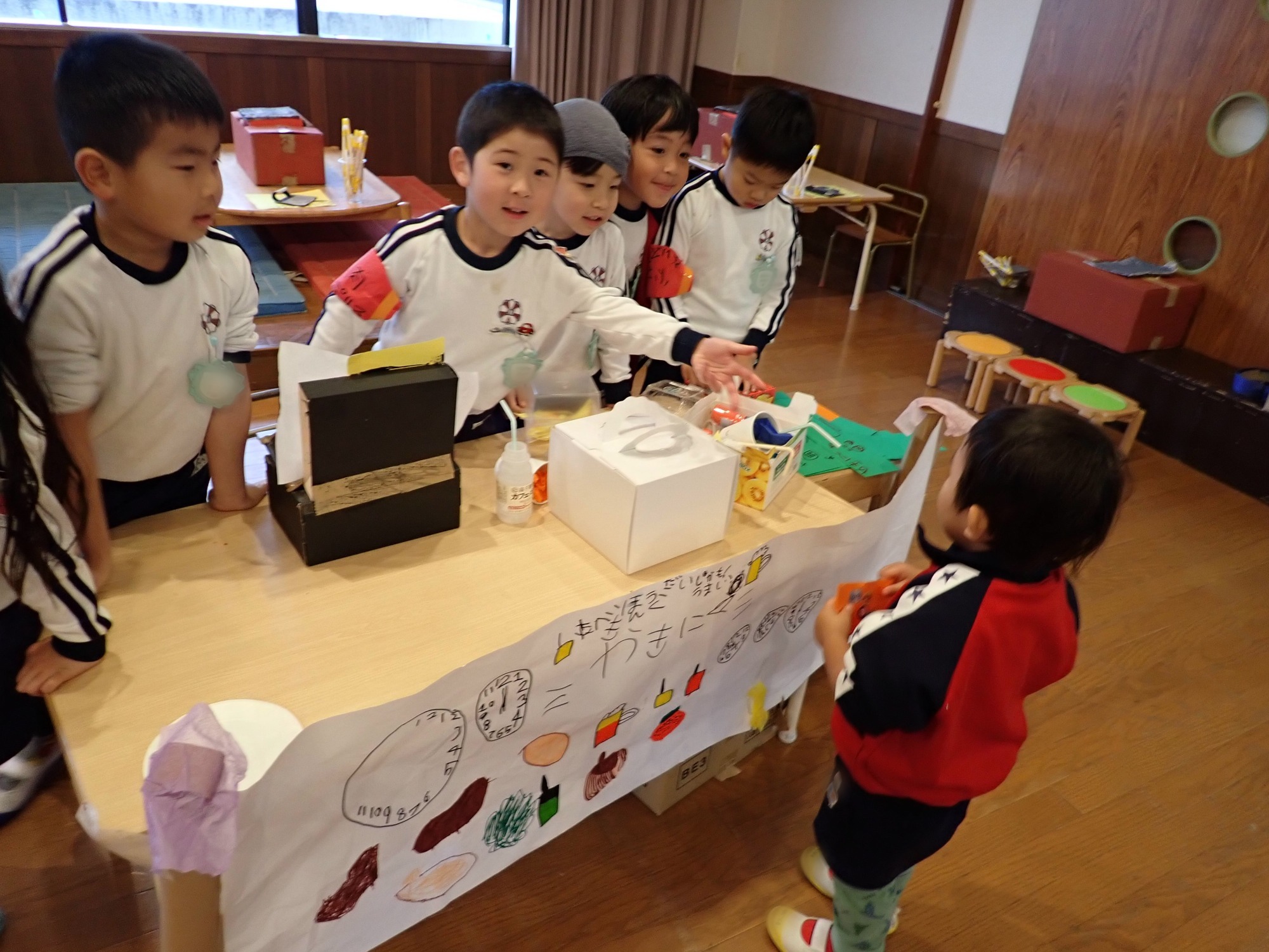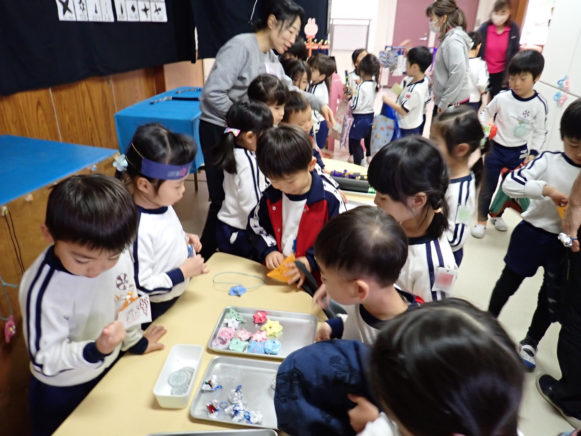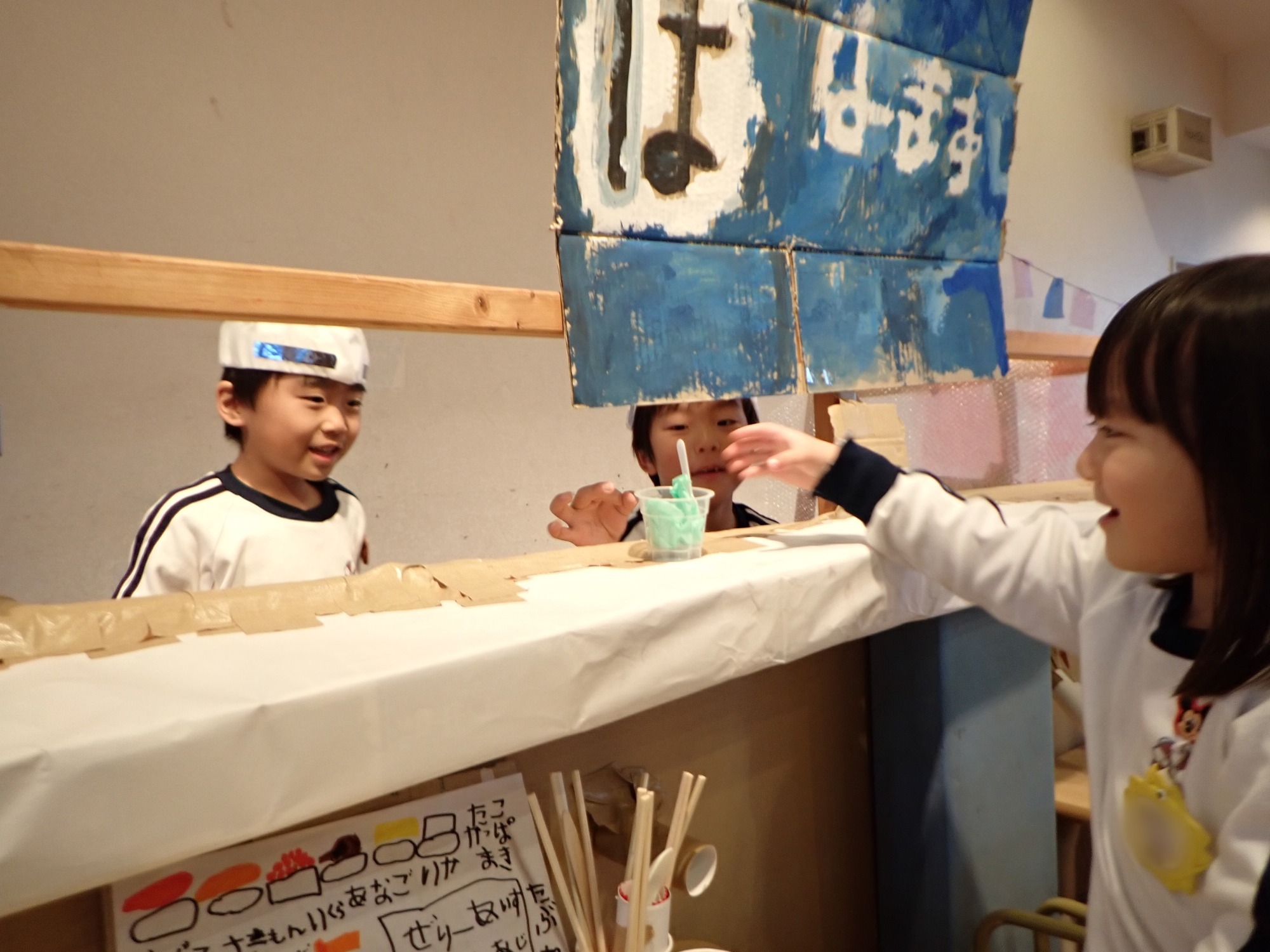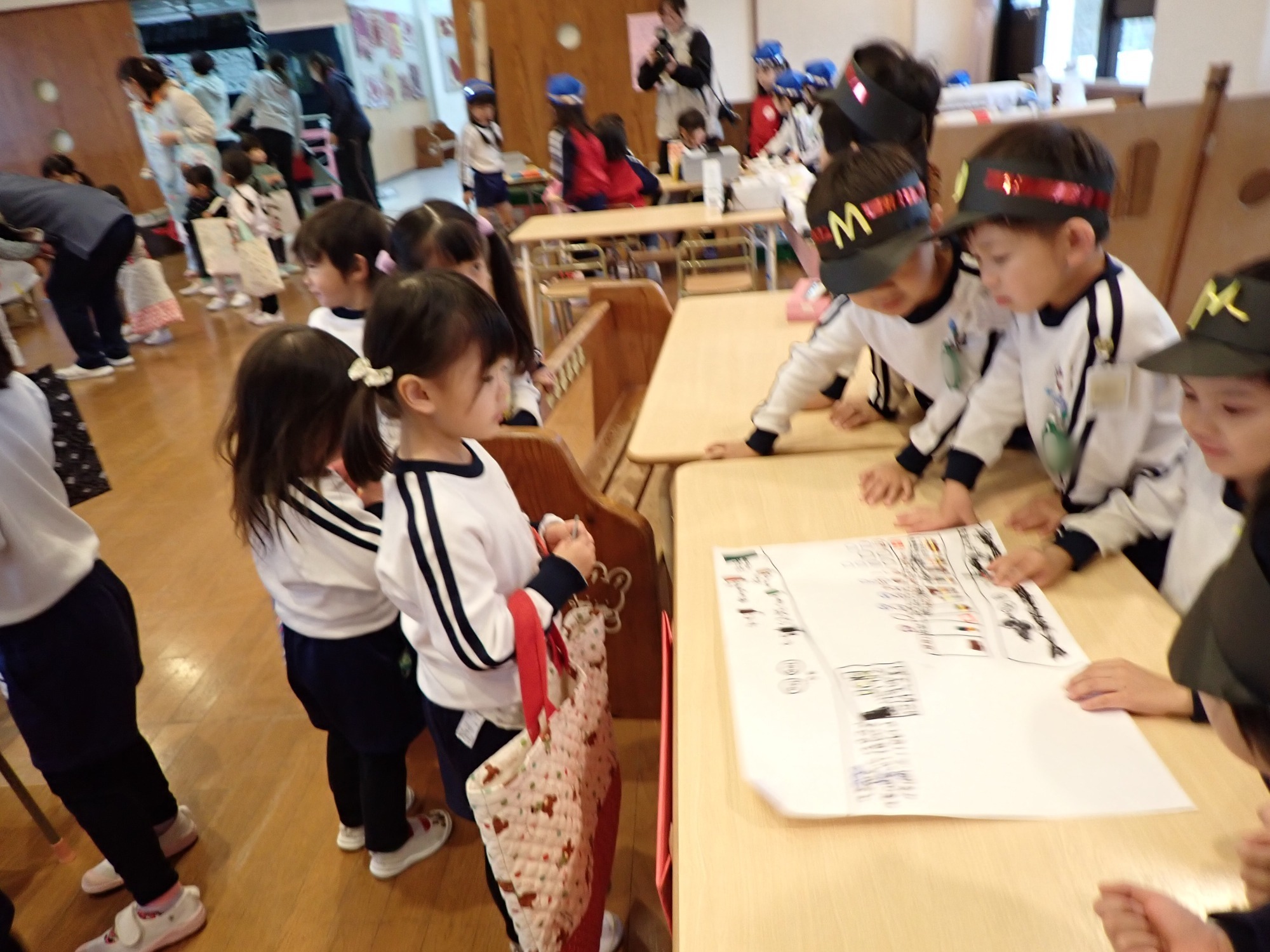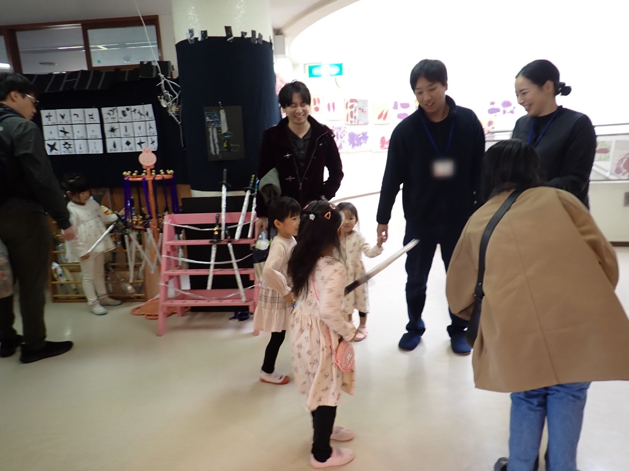 自分や友だちの作品をうれしそうに紹介し、保護者の方とごっこあそびを楽しみながら園内を巡りました。