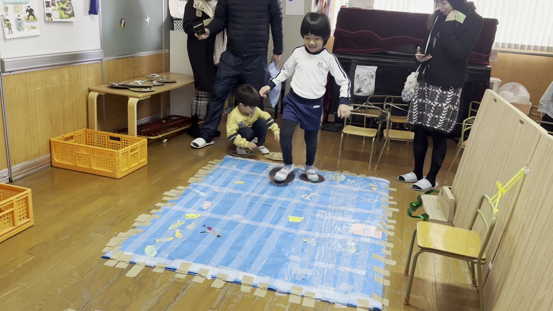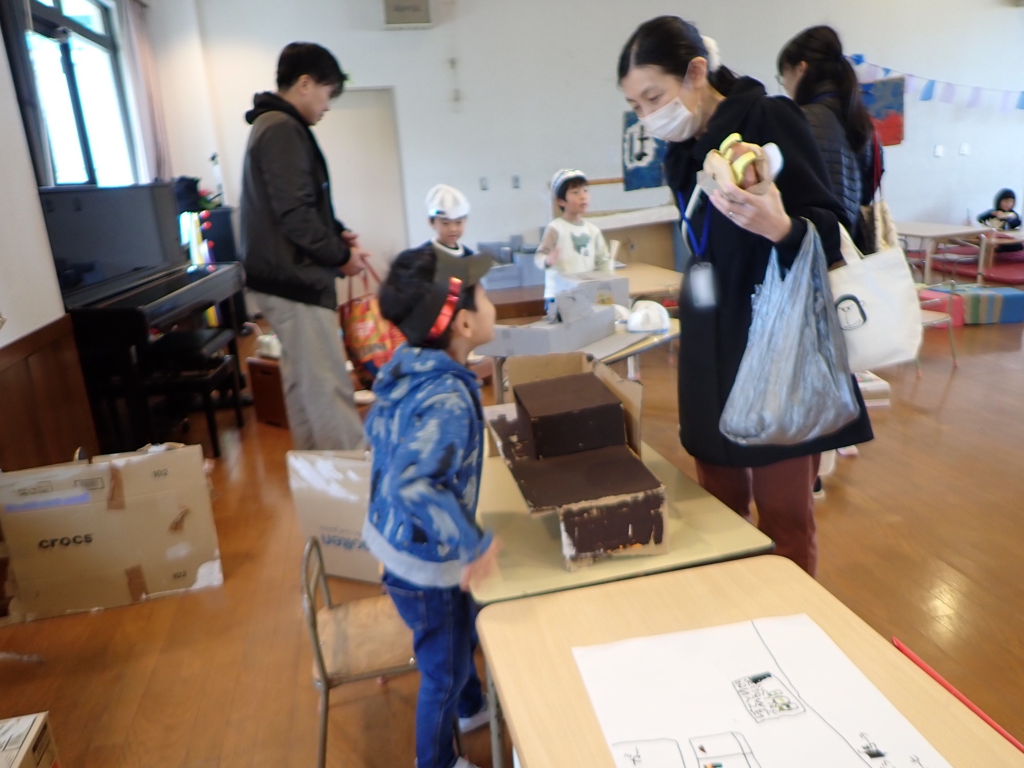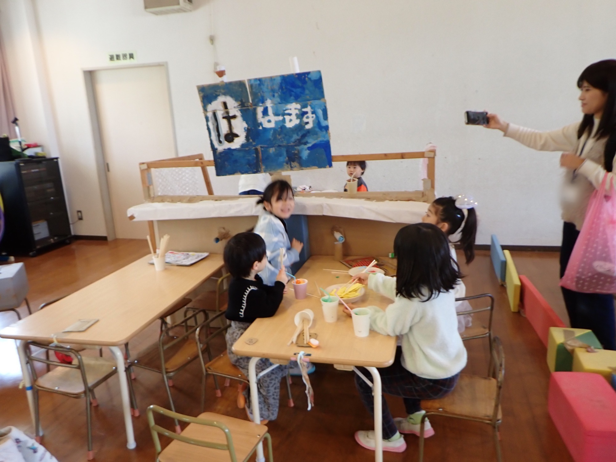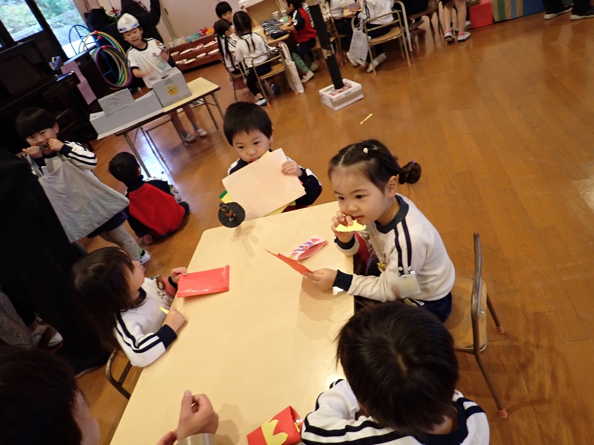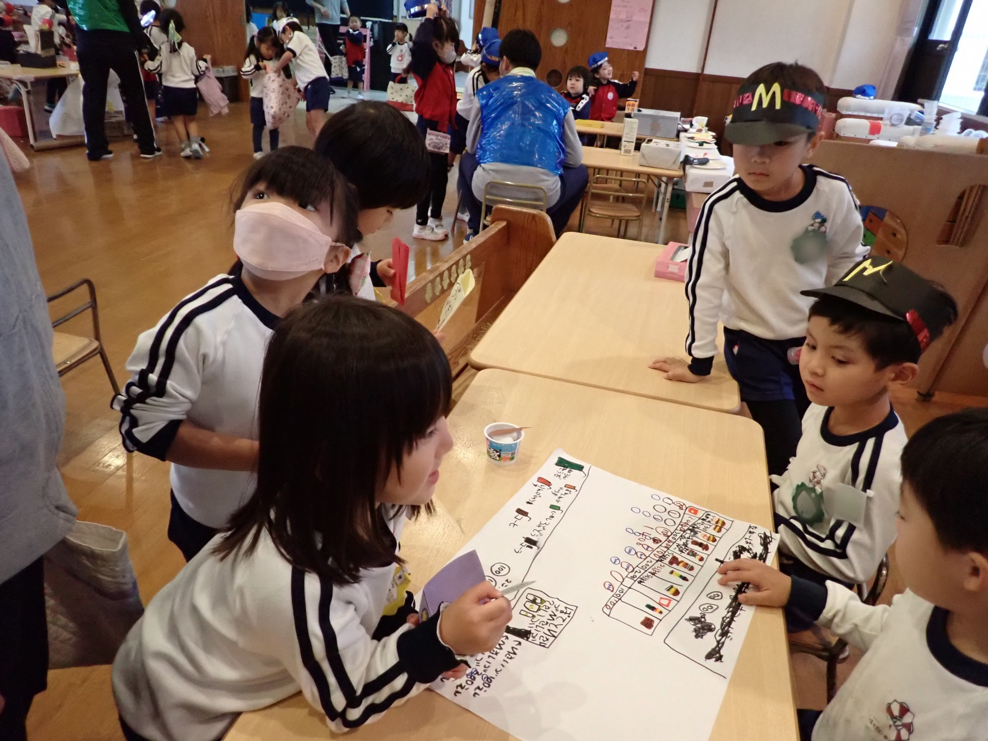 自分や友だちの作品をうれしそうに紹介し、保護者の方とごっこあそびを楽しみながら園内を巡りました。