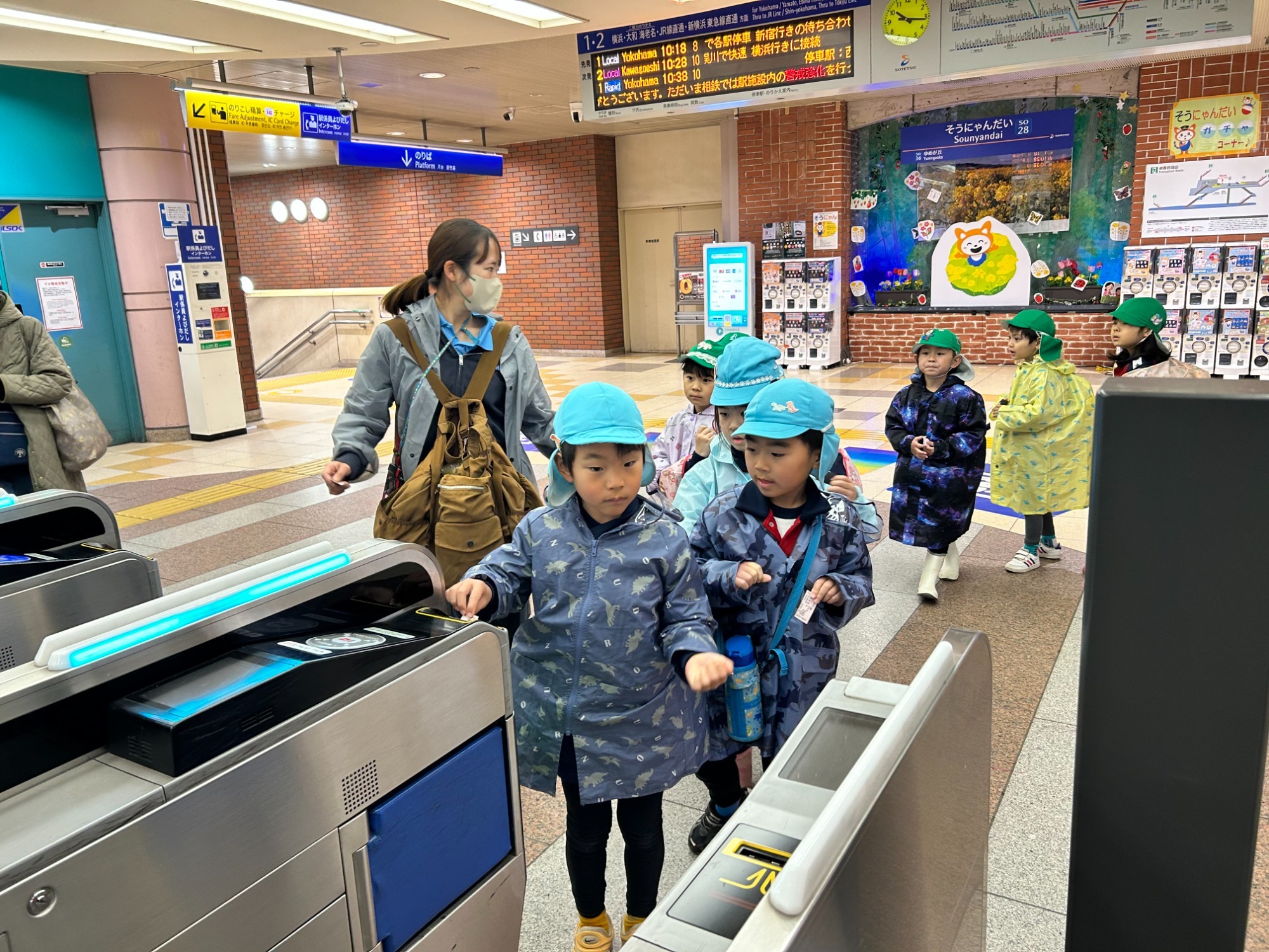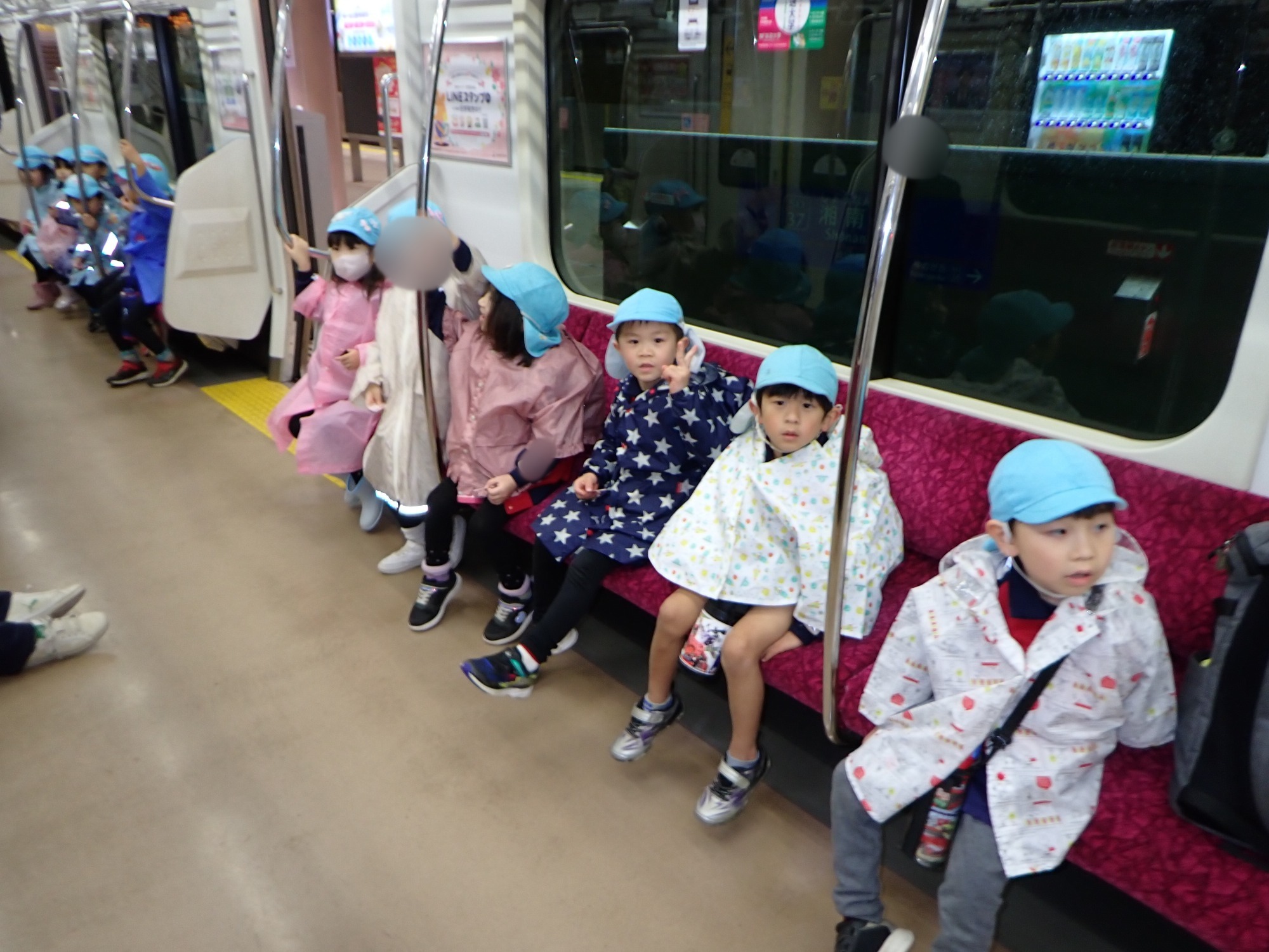 当日はあいにくのお天気でしたが、「電車に乗りたい」という子どもの願いをかなえたく、レインコートを着て出発。