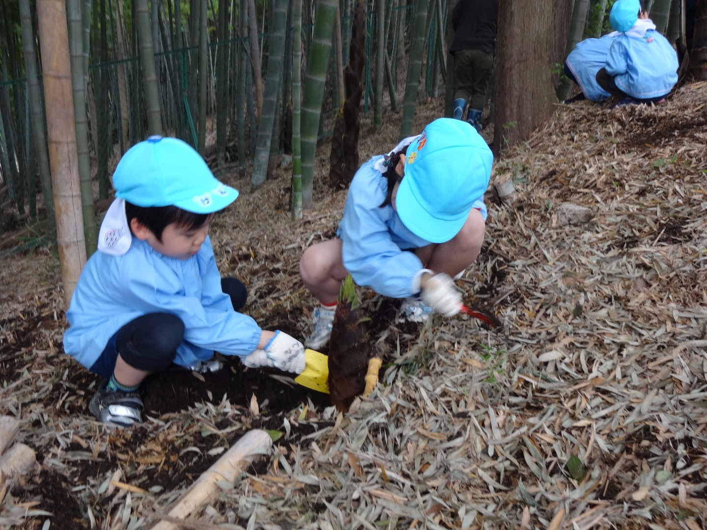 友だち同士、声をかけ合いながらたけのこを掘りました。
